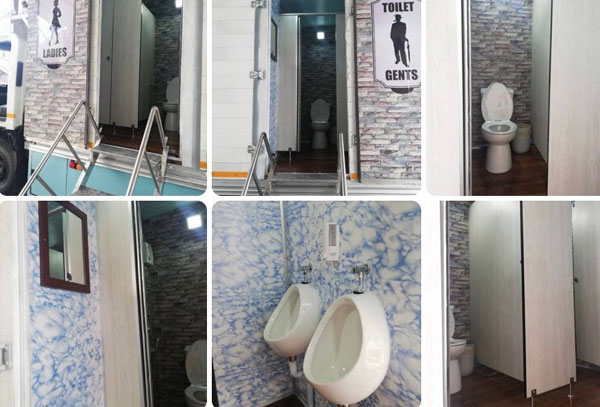 ภายในรถสุขาเคลื่อนที่แยกเป็นห้องน้ำชาย และห้องน้ำหญิง